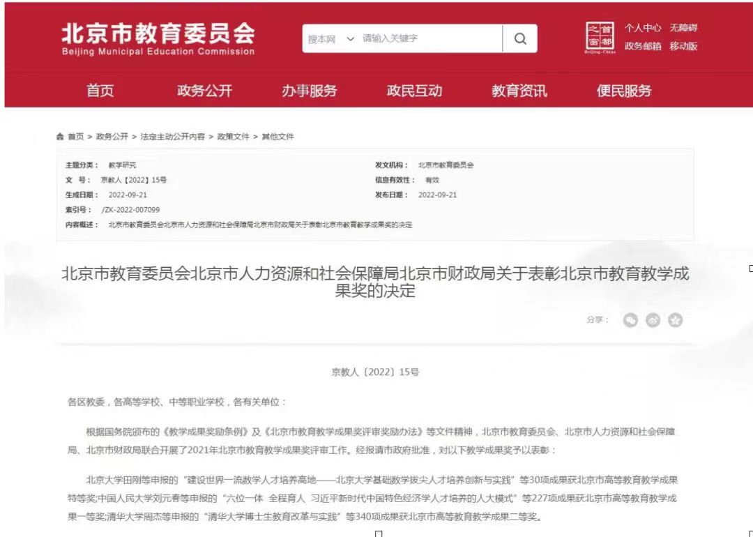 北京市开展教学成果奖励是对学校人才培养工作和教育教学改革成果的检阅和展示,是市委市政府高度重视教育教学工作的重要体现,该奖项每四年评审一次。开展高质量的教育教学活动是学院人才培养战略的重要举措,是学院“质量立院、人才强院、协同办院、声誉扬院”办学理念的重要体现。