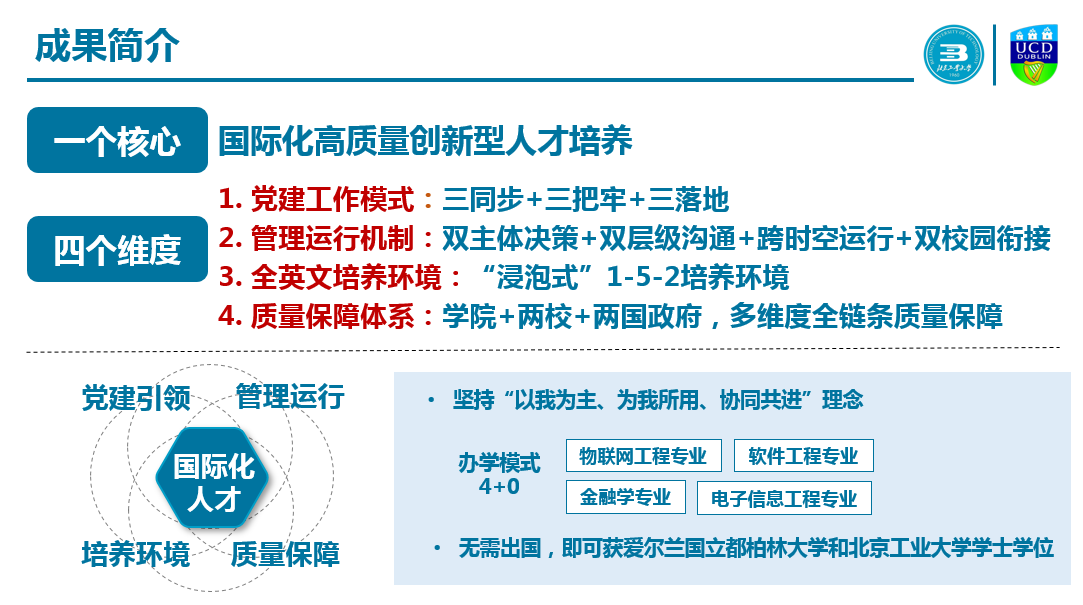 学院以国际化高质量创新型人才培养为目标,建立了一个新模式、创建了一个新机制、构筑了一个新体系,成果体现三个创新点:一是提出了“三同步、三把牢、三落地”党建工作新模式,世界一流大学优质资源与本土大学环境嫁接;二是构建了“双元协同、共建共治”的国际化与本土化结合国际化现代治理体系,实现了国际化高质量创新型人才培养质量;三是创建了152全英文培养环境和“多维度全链条”质量保障体系,打造国际合作办学的工大样板,推动中外合作办学初心落地。