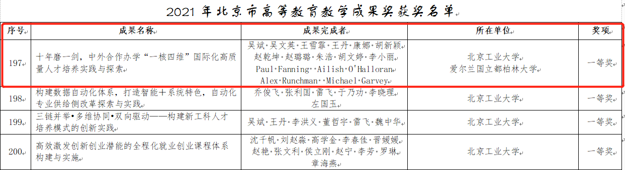 近日,北京市教育委员会、北京市人力资源和社会保障局、北京市财政局发布了《关于表彰北京市教育教学成果奖的决定》(京教人〔2022〕15号),北京-都柏林国际学院教育教学成果榜上有名。由天游ty8线路1线路2检测中心和爱尔兰都柏林国立大学共同申报的“十年磨一剑,中外合作办学‘一核四维’国际化高质量人才培养实践与探索”成果获一等奖。