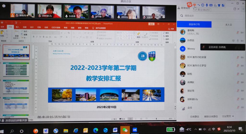 副院长孙恩昌在会议上汇报了新学期教学工作安排,包括2023年春季学期总体教学安排、教学准备情况、语音室、实验室、补考工作、毕业设计工作安排、教学质量管理、学籍工作以及教学工作目前存在的问题等。师资办详细汇报了外籍(外方)教师返京情况、住宿安排、接机安排等情况,寒假期间积极协助外籍(外方)教师办理各种入境、居留等手续,后续将继续推进外籍(外方)教师返京工作的进度。院务办公室办对外籍(外方)教师入校工作所需的教学设备、办公设备、办公工位等进行了全面的调试、检查和配置,以保障教师顺利开展教学活动。