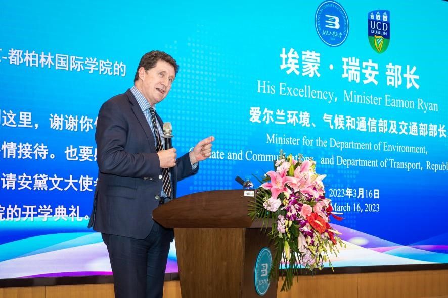 随后,埃蒙·瑞安部长对学院热情接待表示感谢,祝贺天游8线路检测中心入口在去年迎来了建院10周年,并对近年来所取得的成绩表示赞赏。部长埃蒙·瑞安以全球气候问题和绿色发展为主题进行演讲。他表示,面对气候变化对全球带来的重要挑战,爱尔兰与中国,以及世界各族人民,要意识到作为人类命运共同体的重要性,在未来世界各国应进一步加强资源的合作与共享。他指出,爱尔兰与中国看似很多的不同之处,但实际上有大量的共同点,尤其是在共同参与的绿色革命所体现的国际担当和做出的努力都是值得赞赏的,构建更加团结、平等和公正的世界,是两国未来通过精诚合作和互相学习所追求的方向。他说爱尔兰的可再生资源的使用满足了75%的能源需求。到2030年,爱尔兰的目标是将用可再生资源的使用提高到100%, 到2050年实现碳零排放。最后,他强调,为进一步推动可再生资源的发展,解决世界气候与能源危机,最重要的是培养人才和掌握先进的科技。都柏林学院的四个重点专业,则是未来人类变革中的突破口。希望两国进一步加强国际教育合作,在克服疫情等种种困难后,创新与灵活的教育合作方式将会为学院、学校和国家培养更优秀的莘莘学子和国际人才。