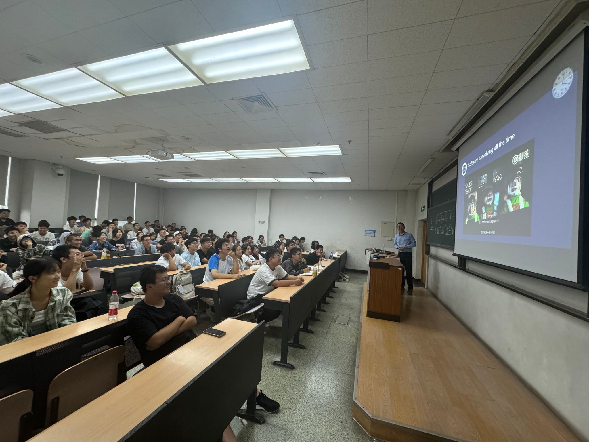 软件工程专业中方负责人李童老师从“软件是如何改变世界”这一问题作为切入点向新生介绍软件的重要性以及如何做好软件。随后,李童老师与新生探讨如何学习好软件工程专业,为新生带来了一堂生动有趣的专业认知教育课。