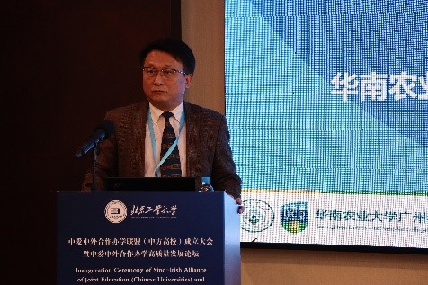 华南农业大学广州都柏林国际生命科学与技术学院院长冯立新以“中外合作办学高质量可持续发展的路径与思考——中爱(SCAU-UCD)模式”为主题,阐述华南农业大学广州都柏林国际生命科学与技术学院在党建引领、提质增效等方面的探索,并结合目前国内外形势所面临的挑战,提出中外合作办学整体工作思路与未来发展出路。