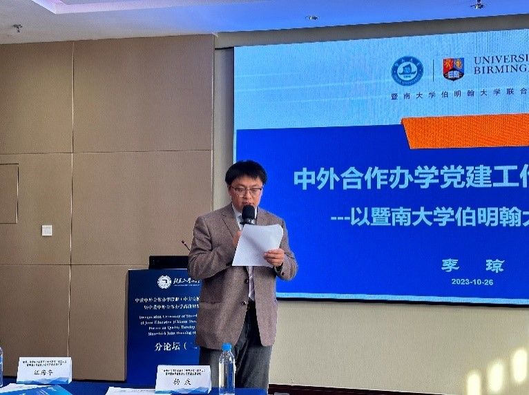 暨南大学伯明翰大学联合学院的李琼书记兼副院长,以暨南大学伯明翰大学联合学院为例,分享了她对中外合作办学党建工作的若干思考,介绍了学院具有中外合作办学特色的“3+2+4”党建行动方案,包括“三个坚持”、“两个关键”和“四个特色课堂”,强调了党建在中外合作办学规章建制方面所发挥的重要作用。