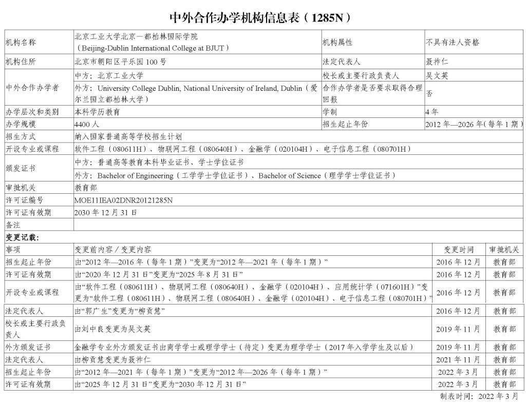 中外合作办学机构北京-都柏林国际学院信息表