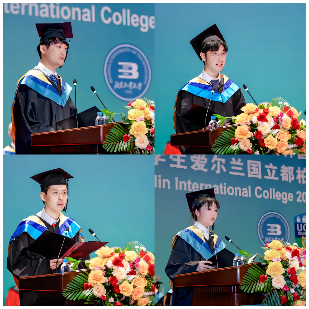 2024届物联网工程专业毕业生代表周榆忱、软件工程专业毕业生代表肖植友、金融学专业毕业生代表杨瀚尧、电子信息工程专业毕业生代表肖青苗分别发言,他(她)们分享了大学学习和生活的感受,表示感谢天游ty8线路1线路2检测中心和爱尔兰国立都柏林大学老师们的悉心教导,在这里感受到了多元文化的碰撞,打开了国际化的视野,培养了跨文化交际能力,在今后的学习生活中会继续顽强拼搏,锐意进取,不辜负母校的期望,以优异成绩回报母校。